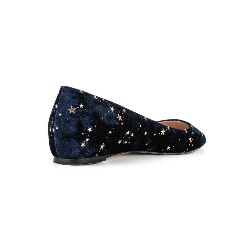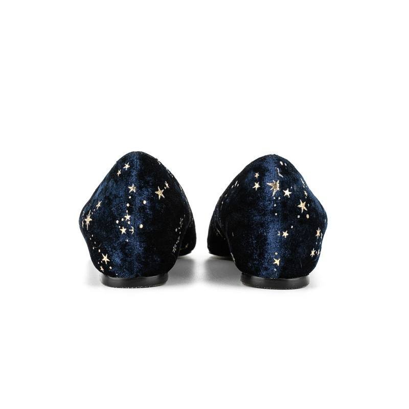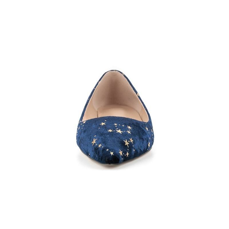 Crafted from plush navy velvet, these flats feature delicate gold star embroidery, blending celestial charm with a sleek pointed toe for refined, all-day comfort.